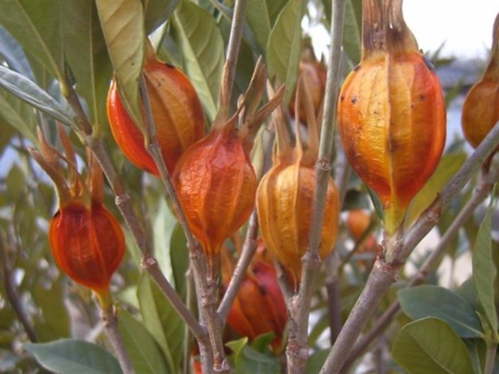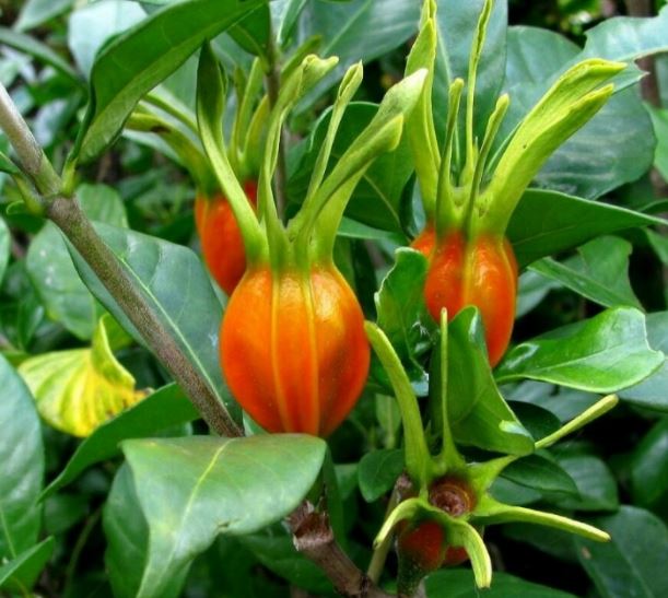 꽃은 흰색으로 피고 달콤한 향기가 나며 말린 열매인 치자는 음식을 노랗게 물들이는